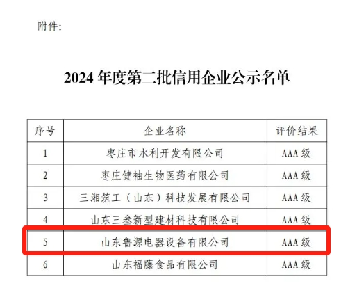 8月6日,《棗莊之窗》從棗莊市企業(yè)聯(lián)合會發(fā)布“關(guān)于公布2024年度第二批信用企業(yè)名單的通知”獲悉,山東魯源電器設(shè)備有限公司等6家企業(yè)獲得AAA級信用等級評價,并予以公布。
